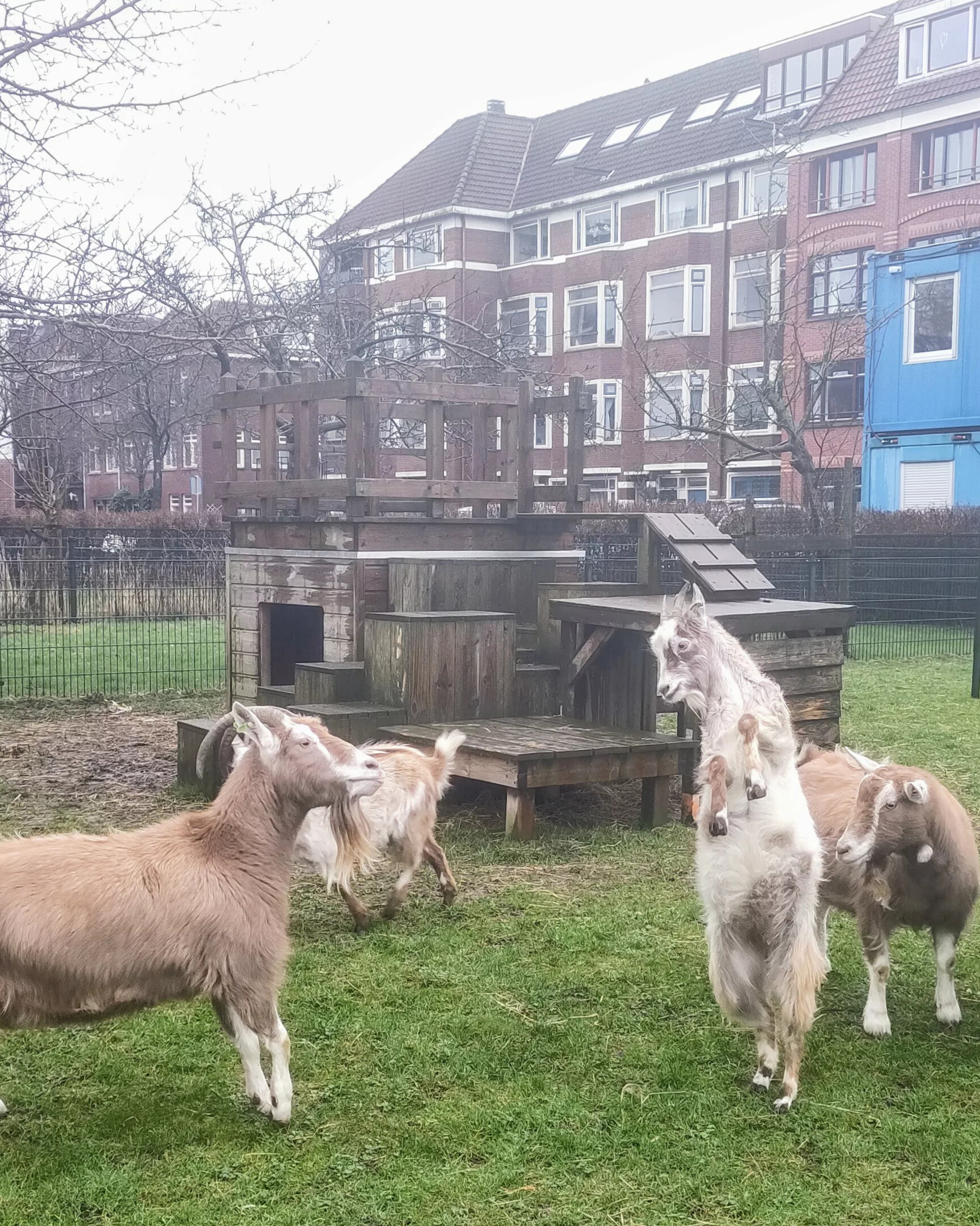 Na een week zijn ze met elkaar in de wei gezet, waarbij de bestaande kudde geiten heel verbaasd leek over de rondrennende nieuwe boerderijbewoners. Nadat het meeste ravotten voorbij was, was het tijd voor kennismaken zonder stalhek.